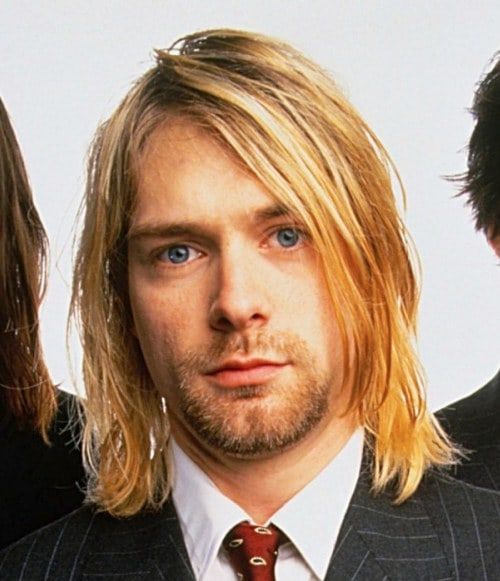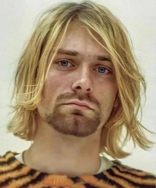 Kurt Cobain’s natural color was a dark blonde that frequently lightened into a faded, almost bleached look — often the result of DIY dye jobs or natural sun exposure. To recreate it, go for soft blonde tones with darker roots and uneven highlights for that lived-in, authentic feel.